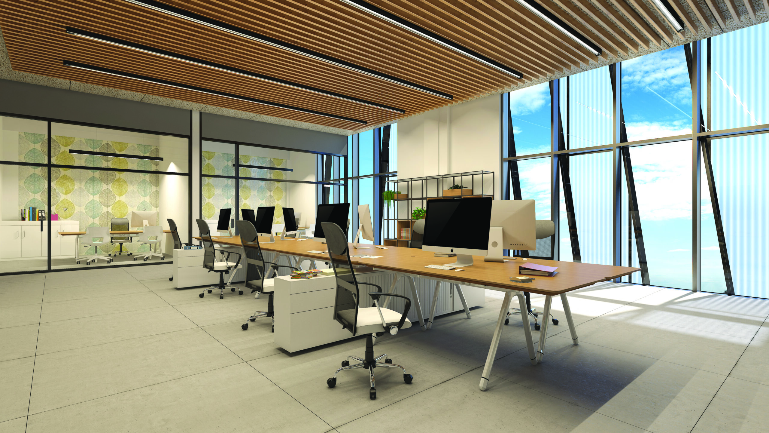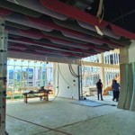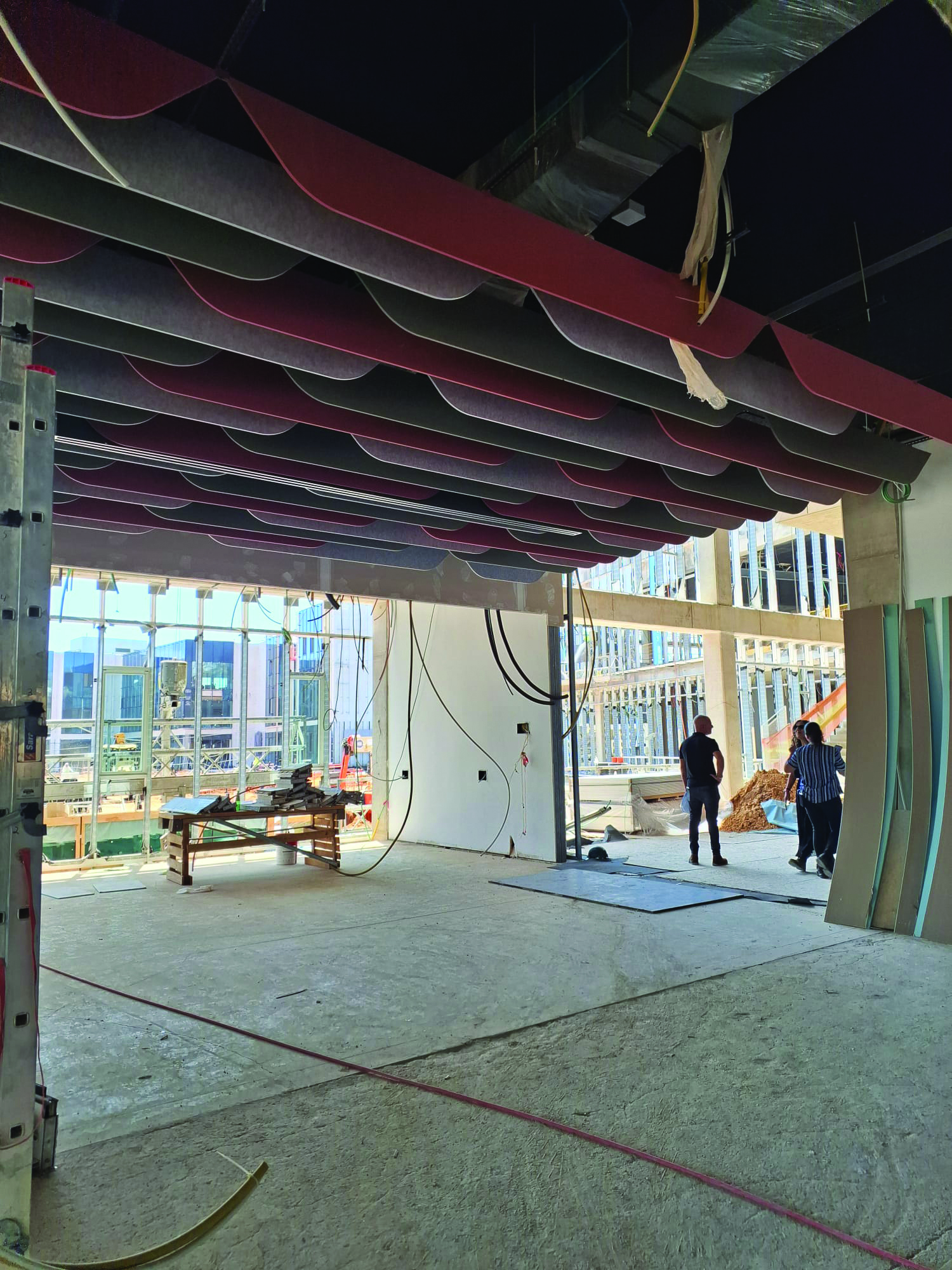 - Exposed and mesh ceilings for optimal acoustics are being placed.