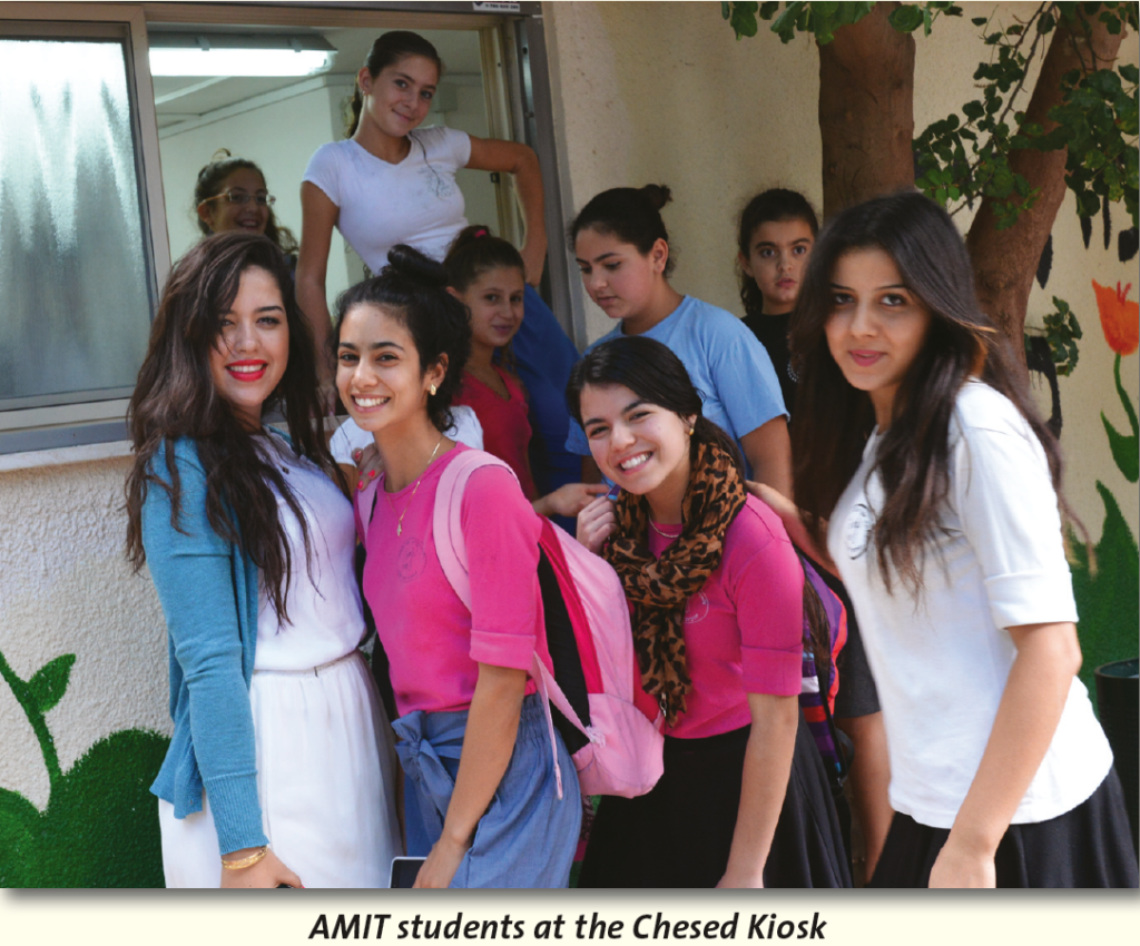 During recess, students line up at the Chesed Kiosk run by the high school girls. Thousands of shekels are raised every year through sales and are donated to dozens of local needy families.
