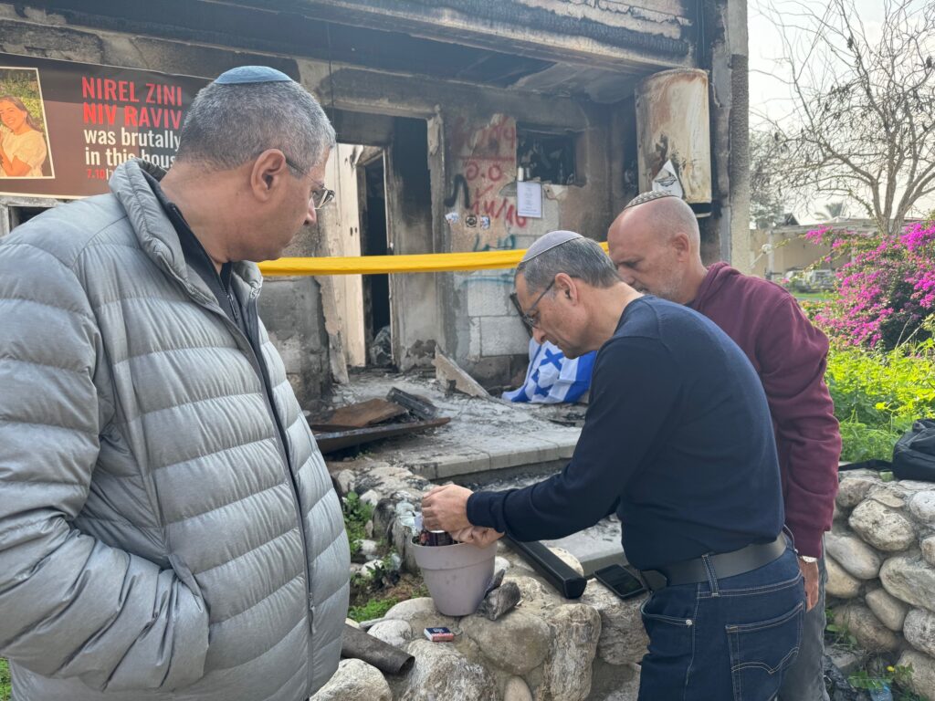 In Kibbutz Kfar Azza’s young neighborhood, accompanied by kibbutz member Shani, the group saw the remains of the horrors of October 7. They held a short ceremony, saying Kaddish, and reciting tehillim there, in the home of Nirel Zini and Niv Arviv, son and future daughter-in-law of a teacher at our Sderot high school who were murdered on Simchat Torah.